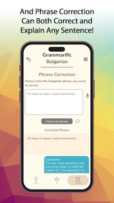 - Phrase Correction: Enter your Bulgarian sentences and our app meticulously corrects them, providing in-depth explanations to ensure you understand and apply grammar rules appropriately.