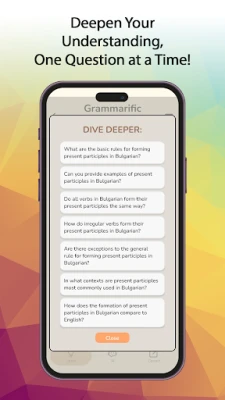 - Dive Deeper: Go beyond the surface with our premium 'Dive Deeper' feature. Examine topics further with 10 additional questions, offering a thorough grammatical exploration.