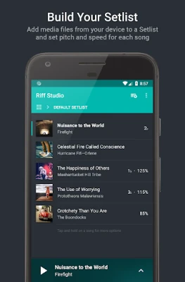 Riff Studio lets you build a setlist of the songs you want to practice, set their pitch and speed independently and before hand, so you can focus on playing your instrument or singing along!